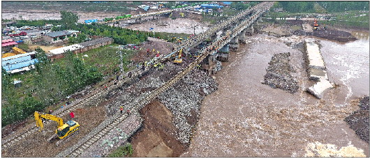 10月6日,受强降雨影响,山西省祁县境内昌源河水位上涨,洪水冲毁路基,导致南同蒲铁路昌源河大桥铁路悬空,铁路中断运行。 新华社发