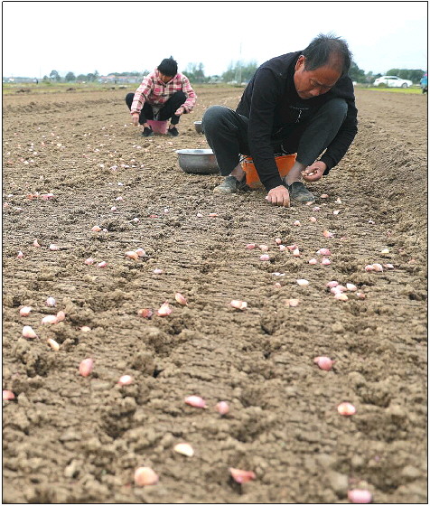 对于当地村民来说,只有大蒜种到了地里,他们才能安心。10日早上5点多,刘卫斌又和妻子来到地里。头一天已经种了一亩来地,现在他们还要抓紧抢种。刘卫斌告诉记者,别看现在的地很湿,蒜种上后,还要再浇一遍水,这样地能平整一些,以便给大蒜套薄膜。