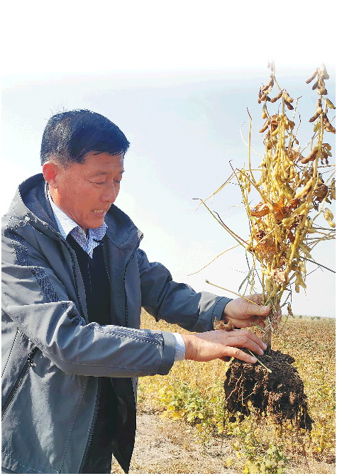 ▲靳振东从地里拔出一株豆子,给记者看粗壮的根茎,植株上满是豆荚。