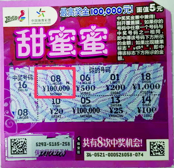 10月11日,王先生来到彩票店,顺手拿起摆在柜台外边的几张剩票“甜蜜蜜”刮了起来,当刮到第7张的时候,你的号码出现了与中奖号码相同的数字“08”,刮开下面对应的中奖金额的时候,王先生激动的大喊一声:“中了、中了10万。”