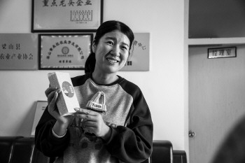 王红艳正在展示其公司产品。