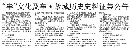 为丰富藏品类型形态,积极开展“牟”文化研究,进一步探讨牟文化的真谛,深入研究牟国故城文化渊源,丰富和扩大牟国历史的内涵与外延。济南市钢城区文化和旅游局自发布之日起,面向社会各界进行“牟”文化及牟国故城历史史料征集活动。