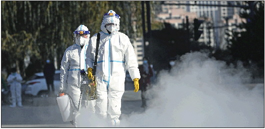 11月8日,在青海省西宁市城西区海湖体育中心采样点,工作人员对采样区域消杀。 新华社发