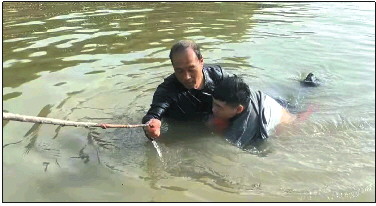 董龙祥(左)跳进河中救起落水少年。 视频截图