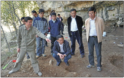 扁扁洞遗址发掘期间,孙波(前左)邀请山东大学历史文化学院教授栾丰实(前右)和时任山东省文物考古研究所所长郑同修(前中)现场考察指导。