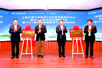 于远臣为揭牌仪式致辞,介绍了烟台山医院的基本情况,向烟台市委市政府、烟台市卫健委、烟台市科技局对医院发展的大力支持及上海九院3D打印团队的指导帮助表示衷心感谢。他表示,医院将抓住机会、深化交流,强化优势、创新发展,为烟台卫生健康事业发展贡献智慧和力量。赵全红在致辞中对烟台山医院主动担当、创新发展给予充分肯定,对双方合作充满信心,同时指出了烟台卫生健康发展思路,对医院创新工作提出进一步要求。中国工程院院士、中国医学科学院学部委员、法国国家医学科学院外籍通信院士、我国骨科学和骨科生物力学专家戴尅戎院士通过视频,对上海交通大学医学3D打印创新研究中心烟台山医院分中心正式揭牌表示热烈祝贺。郝永强教授在致辞中指出,健康医学与个性化诊疗是当今和未来医学发展的重要方向,希望与烟台山医院携手,以个性化治疗理念为引领,医工结合,充分发挥烟台山医院骨科等学科优势,推动医学3D打印的人才培养、科学研究及临床应用。随后,上海交通大学医学3D打印创新研究中心烟台山医院分中心、戴尅戎院士团队工作室正式揭牌。