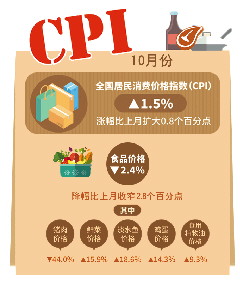 国家统计局10日发布数据,10月份,全国居民消费价格指数(CPI)同比上涨1.5%,涨幅虽比上月扩大0.8个百分点,但仍低于宏观调控预期目标,消费市场供需基本平稳。