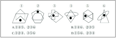 A。解析:每幅图都由一个小圆圈和一个多边形组成,小圆圈在①③④中靠近多边形的最长边;小圆圈在②⑤⑥中靠近多边形的最短边。故正确答案为A。