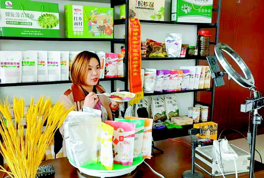刘兴伟在直播间里推销自家工厂生产的农产品。