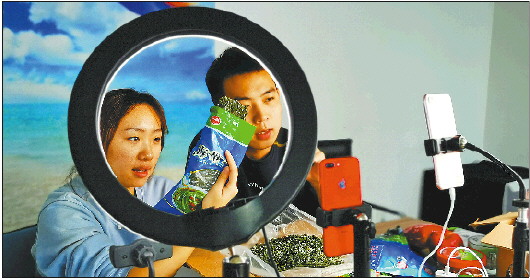 在威海海洋职业学院大学生创业孵化基地,学生小丽(化名)正拿着一包干海带丝,和直播间的“宝宝们”热情互动。
