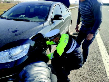 当日上午11点半左右,大队巡逻民警巡逻至青银高速河北方向423公里处时,发现一辆黑色小轿车停在应急车道上,俩男子正拆卸着轮胎,车后150米外摆放着三脚架。巡逻民警立即做好预警工作进行了解情况,原来驾驶员是从烟台打工,回临清老家探亲的,行驶途中发现车的左前轮气压过低,于是做好预警准备自行换胎。
