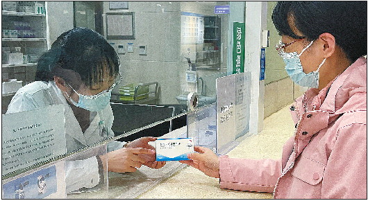18日,在山东省眼科医院药房窗口,药师正在向患者介绍0.01%硫酸阿托品滴眼液的使用方法及注意事项。