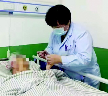 说起三年前的经历,蒋海霞仍眼含热泪。2018年10月,医院收住了一位从其他养老院转过来的老年病人朱大爷,83岁的朱大爷身上又脏又臭,需要立即洗澡。进入浴室给老人脱去外衣后,护士、护工一下子呆住了,她们手足无措,都将目光转向了蒋海霞。蒋海霞来到老人身边也惊呆了,老人腰骶部、臀部、背部、脚跟等多处褥疮,创面覆盖着厚厚的结痂并向外渗出脓液,还有多处露出了骨头,下半身大便和脓液混在一起,异味扑鼻。出现这种情况,如果创面接触热水会剧痛难忍,蒋海霞便用毛巾蘸温水慢慢地给浸润擦试,一边小心地擦一边说“大爷有点疼,坚持一下,干净了就舒服了”。她擦试了一个多小时才给朱大爷清理干净。紧接着蒋海霞又给老人洗头、洗脚、剪指甲。出浴室前朱大爷紧紧抓住蒋海霞的手问她叫什么名字,连说:“谢谢你了,你是个好孩子,真没想到我快死了,还能干干净净地走。我4个儿子都不在家,把我放养老院好几年了,没想到老天爷对我这么好,临死前碰到你了小蒋!”蒋海霞心里发酸,坚持着没哭出声,她强忍着眼泪对朱大爷说:“您老身体没大碍,安心在这里住下,把我当您的闺女就行。”三天后朱大爷去世了,蒋海霞呜呜大哭。朱大爷的家人劝说蒋海霞:“您比俺们照顾得都好,老人走得很安详,我们全家感谢您,感谢医院!”