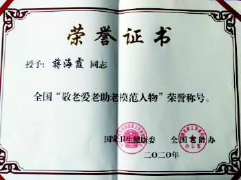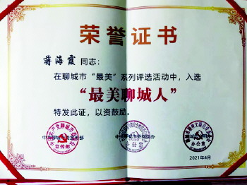 莘县中医医院康养院是医养结合为特色的专业护养机构,2018年和2019年,蒋海霞连续两年获得莘县卫生计生工作先进个人,2020年蒋海霞荣获全国“敬老爱老助老模范人物”称号,2021年4月又荣获“最美聊城人”称号,对于付出了无数艰辛和无限爱心的蒋海霞而言,这些荣誉实至名归。