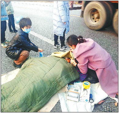 下午寒风刺骨,气温越来越低,医护人员从大巴车上拿下被子和军大衣紧紧地盖在老人身上。现场来往车辆很多,且车速很快,大家分工明确,有的照顾老人,有的则站成人墙,指引过往车辆,保护急救现场,防止二次伤害。寒风中,医护人员的手都快冻僵了,但他们一边用手电筒查看老人瞳孔大小,并一遍一遍地喊着:“大娘,你别睡,救护车马上就来了,坚持一下。”终于,救护车赶来,东营市人民医院的医护人员和急救人员一块将老人抬上救护车。医生们向急救人员详细交代了老人伤势情况后,看着急救车远走,大家才继续上路返程。