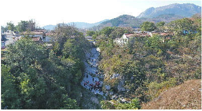◥“齐鲁古道行”文化考察团师生行走在青石关外的峡谷中。