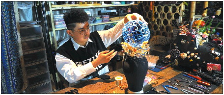 王平正在他的工作室里制作国潮头冠。