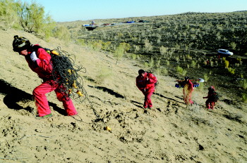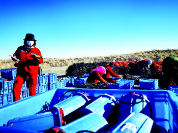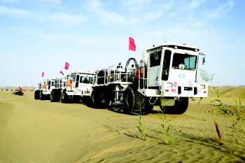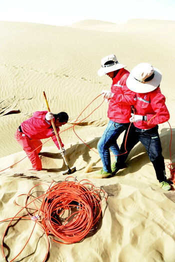 回忆起施工期间遭遇的15场沙尘暴袭击,SGC2104队党支部书记吕长春仍心有余悸,特别是10月2日持续25小时的强风沙尘暴,造成施工道路严重损毁,迎风面检波器悉数被风吹出,背风面检波器、电源站、电瓶被沙子深埋。队上立即启动应急预案,调集20台推土机、105台车辆、1000余人全力进行道路复修和排列整改。