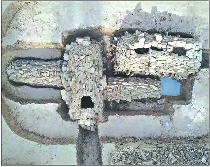 据了解,此墓葬占地约25平方米,空中俯瞰像一架粗制的飞机,一侧“机翼”下多出一个长方块,又像一个静止的海龟,外表青砖不规则层叠引起人们无限想象。此墓共埋葬7人,墓坑是一次性完成。主墓室大致呈南北走向,东西两侧不对称,与主墓室相联通,比主墓室低约1米,东西长2.1米。入葬7人之间的关系暂无法估测,待测试DNA后才能确定,怀疑7人同时下葬。