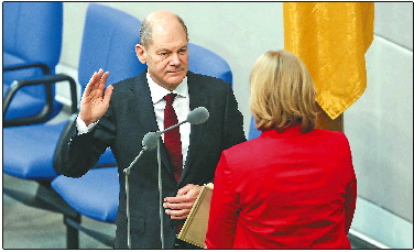 12月8日,在德国首都柏林的国会大厦,朔尔茨(左)宣誓就职。 新华社发