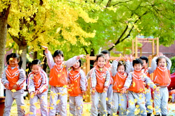 在济宁市实验幼儿园总园区内,有一条长长的石板路,路两旁生长着银杏树,孩子们把这条路叫作银杏大道。从春夏的翠绿到了秋冬的橙黄,银杏树如同深沉的长者,给孩子们遮雨、避阳,见证着孩子们的成长。