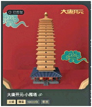 11月3日,西安数字光年软件开发有限公司与西安大唐不夜城联合发布的“大唐开元·小雁塔”和“大唐开元·钟楼”数字藏品正式对外发售,限量发行各1万份,这也是西安首个3D建筑模型的数字藏品。