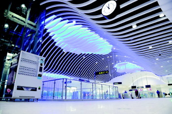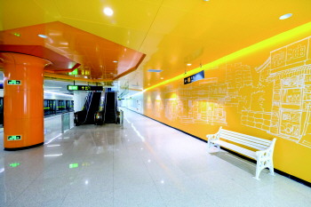青岛地铁一向重视地铁空间的艺术设计。青岛地铁集团第一建设分公司设备管理处处长李杰介绍,青岛地铁2号线一期工程首次提出地铁“空间一体化”装修新理念,车站公共区装修采用“四位一体”创新设计方法,将以往地铁空间的割裂元素“化零为整”,把装修、导向、艺术品、广告等进行统筹考虑、整体设计,全方位提升车站艺术化、个性化,其设计水平是地铁空间装修领域的一次重大突破。“青岛地铁为此专门成立地铁艺术设计专家委员会,由国内各美院的知名艺术家和青岛本地文化学者组成,设计方案由委员会多轮审核确认,取得非常好的效果。同时,在保证艺术性美观性的前提下,设计组因地制宜采取多种创新、环保、节能的通风空调系统,节能效果也非常显著。”