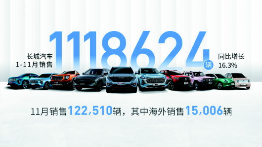 1-11月,长城汽车销售新车1,118,624辆,同比增长16.3%,今年累计销量已超越去年全年;