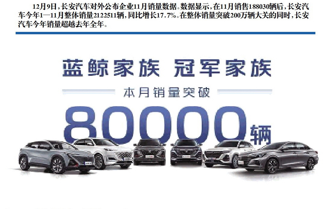 12月9日,长安汽车对外公布企业11月销量数据。数据显示,在11月销售188030辆后,长安汽车今年1—11月整体销量2122511辆,同比增长17.7%。在整体销量突破200万辆大关的同时,长安汽车今年销量超越去年全年。