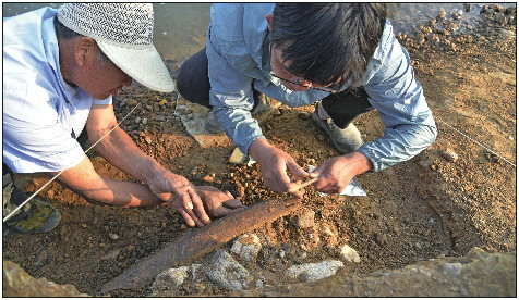 我清楚地记得那天是5月12日,当时考古队员在清理探沟2的下文化层(后来划定的第梺嵨幕?,他们大声地喊我。我过去一看,这一文化层中赫然出现了一根象的门齿和一段臼齿。天哪!当时我便注意到门齿较粗一端断面平齐且规整,好像经过打磨和抛光一样,它光滑的铲面和硕大的体量给人以巨大的震撼。这意味着什么?这很可能是当时人类曾经用过的工具!我接过队员手中的工具,接着清理,我能感受到我的手甚至有点哆嗦。