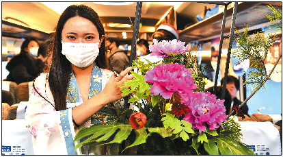 在菏泽东至北京南的列车上,一位工作人员在展示牡丹插花作品。 新华社发