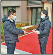 ◤不动产登记中心负责人上门为业主送不动产登记证书。