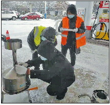 计量检定人员冒雪为加油站进行检定。