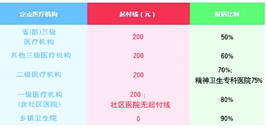 一个医疗年度内,在三级医疗机构住院的医保起付线是1000元,二级及一级医疗机构400元,社区医疗机构及乡镇卫生院200元。省(部)三级医疗机构报销50%,其他三级医疗机构报销60%,二级医疗机构报销70%,一级医疗机构(含社区医院)报销80%,乡镇卫生院报销90%。