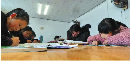 孩子们向郭蔚介绍自己的学习情况,记者(左)全程见证。(视频截图)