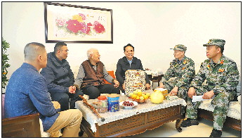 济南市人防办党组书记、主任杨庆绪(右三)看望抗美援朝老战士并赠送人防战备应急包。