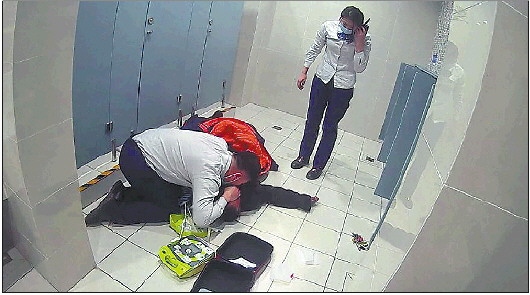 当天中午12点41分31秒,山里站的保洁员在卫生间工作时,一名从隔断里走出来的男乘客突然倒地。保洁员上前简单询问,然后迅速跑到站台叫来了站台岗王栩柠。王栩柠第一时间上前查看并通过手台通知车控室。得到消息的车控室全员应战,有的负责拿药箱,有的拨打急救电话,有的安排调取AED,值班站长郭守花和厅巡岗邵钰卿则直奔卫生间。