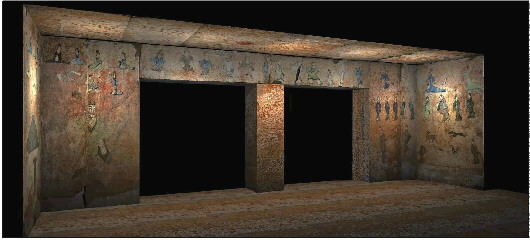 此次发掘的3座大型壁画墓中,有两座为多室石室墓,一座为石室砖室墓,在墓葬的门楣或前庭立壁及顶部绘有彩色壁画,其中以1号墓出土的彩色壁画最为丰富,保存也最为完好。1号墓为西向长墓道、双墓门、平顶前庭、并列四石室大型墓葬,南北宽5.35米,东西长3.66米,高3米,面积为20多平方米。中间两室为一对夫妻,旁边两室为存放物品的地方。墓门及门楣、立柱外侧为雕刻的画像,门楣内侧里面、前庭南北两壁及西壁、前庭顶部绘有彩色画像,壁画面积12平方米左右。