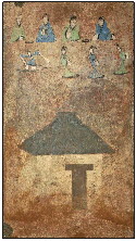 西壁北侧壁画主要绘的是升仙导引图、拜谒图、武士图等,也分三层。上层绘一高髻蓝衣女子,宽袖长裙飘舞,似神似仙,右手持一带柄鼓形或镜形物,左手后甩,衣袖飘扬身后,作转身右趋前行状。该女子裙裾飘飘,似在云雾中前行。蓝衣女子身后绘一背包裹灰衣侧立男子,衣袍后飘,似随女子向前奔走。其后一绿衣男子随他拱手前行,似主仆相伴而行。中层绘相互拜谒男子5人,做拱手拜谒、攀谈或倾听状。5人都身佩长剑。下层绘男子3人,前一佩剑长者,身后跟两个右手持剑、左手持盾的男子,似长者随从。