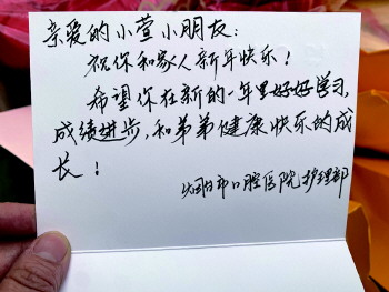 122号孩子小萱父母离异,爷爷患有癌症,奶奶有青光眼,临近春节她最大的心愿是能有一身过年的新衣服和一个篮球。认领小萱礼物的是烟台市口腔医院护理部和消毒供应室的白衣天使,她们不仅为小萱准备了新羽绒服和篮球,得知小萱还有个弟弟后,有爱心的白衣天使也为弟弟准备了过年的新衣服。“希望你在新的一年里好好学习,和弟弟健康快乐地成长。”在给小萱的贺卡中,护理部的白衣天使不忘送出鼓励。