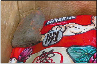 吴先生提供的照片显示,快递箱内大礼包上面压着一块砖头。“每个箱子都是三袋坚果大礼包,就这个箱子里面出现大砖头,少了一袋大礼包。”