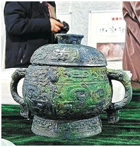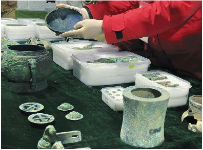 ▲考古工作人员展示北京琉璃河遗址出土的铜簋。