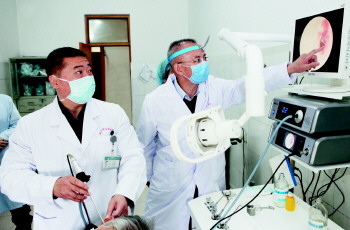 北京同仁医院耳科专家于子龙教授(右)与德州市立医院耳鼻喉科主任姜涛(左)讨论病例