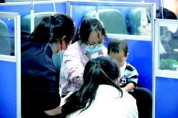 “医生,我的孩子发高烧了!”“医生,孩子咳嗽都好几天了!”……记者挤过人群来到儿科门诊4诊间周嘉云主任的诊室,还未排到的家长不断打开门向内探视,室内的家长则焦急地向医生询问孩子的病症。“张嘴,啊……我看看。”周嘉云有序地为前来就诊的孩子做检查、开处方,让原本焦急的家长也渐渐安定下来。