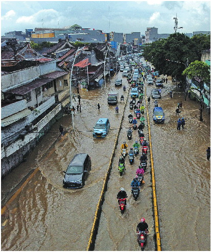 车辆在印尼首都雅加达被洪水淹没的街道上行驶。 新华社发