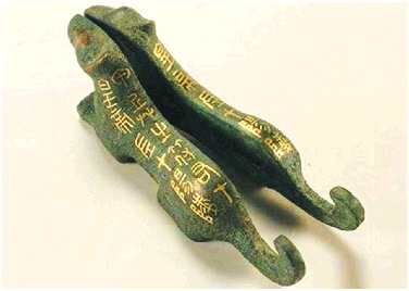虎符,古代帝王授予臣属兵权和调发军队的信物。用铜铸成虎形,背有铭文,沿虎脊一分为二,右半留在中央,左半发给地方官吏或统兵的将帅。调发军队时,须由使臣持符验合,方能生效。虎符盛行于战国、秦、汉。唐高祖避其祖李虎的名讳,废除虎符,改用鱼符,武则天改为龟符,中宗初年又恢复为鱼符。南宋时恢复使用虎符,元朝则用虎头牌。