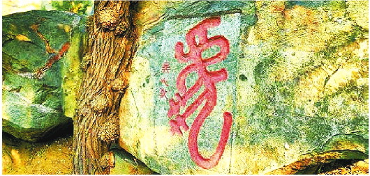 ◥泰山阜虎石边镌有篆书虎字刻石,由清代吴大澂所书。