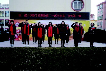 2月17日,统一路小学举行“书香润泽少年志 薪火传承向未来”开学第一课。教师代表庄严宣誓后,全校师生共唱《一起向未来》,为新学期鼓劲。(冯永香)