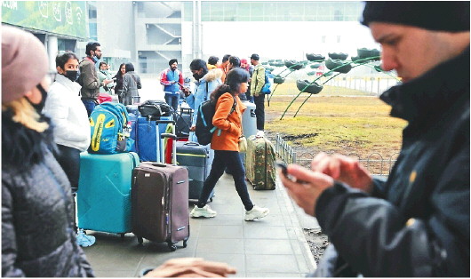 当地时间2月24日,乌克兰首都基辅,民众携带行李赶往基辅机场。当日,俄罗斯总统普京宣布在顿巴斯地区展开军事行动,乌克兰首都基辅上空传来数次爆炸声。乌克兰最高拉达(议会)24日投票通过关于在乌克兰全境实施战时状态的总统令。