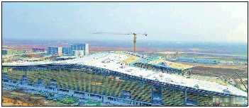 在建设工地上,塔吊林立,挖掘机、拌灰机正有条不紊地快速作业,一座航站楼的主体结构拔地而起,航站楼外部,工人正在高空作业车上进行幕墙施工;在航站楼北面的跑道与停机坪施工处,挖掘机、拌灰机有条不紊地快速作业,一辆辆货车来回穿梭,清运渣土……